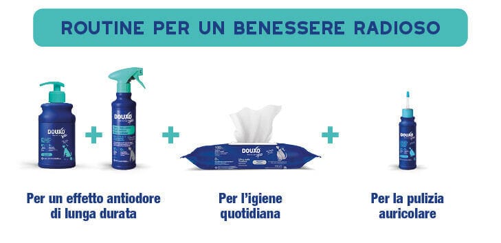 Per una routine completa, abbinalo a DOUXO® SPA Shampoo Antiodore, DOUXO® SPA Salviette Detergenti Multiuso e DOUXO® SPA Detergente Auricolare.